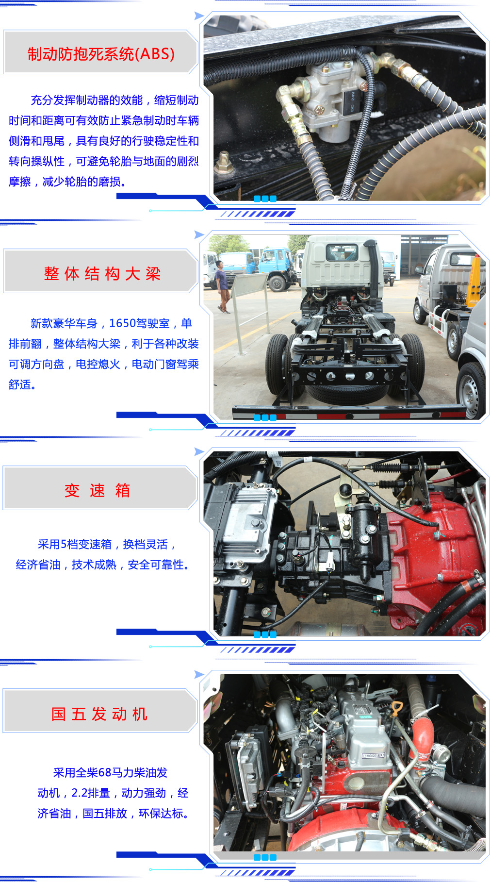 | 其他 | 1,介質(zhì):液態(tài)污物和糞便,密度:800千克/立方米,罐體有效容積:2.07立方米,罐體外形尺寸(長×長軸×短軸)(mm): 2600×1300×900。2,防護(hù)材料:Q235A,連接方式:側(cè)防護(hù)與副梁焊接連接,后防護(hù)與車架焊接連接,后部防護(hù)斷面尺寸(mm):200×50,后部防護(hù)離地高度(mm):500。3,ABS系統(tǒng)控制器型號(hào):YF8,ABS系統(tǒng)控制器生產(chǎn)企業(yè):武漢元豐汽車電控系統(tǒng)有限公司。4,車輛顏色,文字噴涂及局部細(xì)節(jié)可變化。 | ||